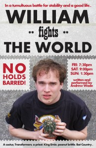 Today, I performed William Fights The World (formerly William Vs. The World, as many people still entirely unrelatedly mistakenly called it, and probably soon to be retitled ‘William wrestles the World’ as one festivaler recommended for alliteration) for the first time. My first time carrying a one-man-show, speaking to an audience and holding their attention for 45 minutes, all the while figuring out better blocking on the fly, coming up with new and awesome jokes mid-show (none of which, tragically, I was able to remember, post-show), reacting with the audience, sharing in a story and a character with them, growing, and living, dagnammit, living in the space. The additions (a cactus, a few lines here and there), felt a necessary partof the show (and not just grafted on). The fantastic techies helped me build the lighting and sound cues hours before the first performance, and intelligently covered when I missed one of their cue lines.